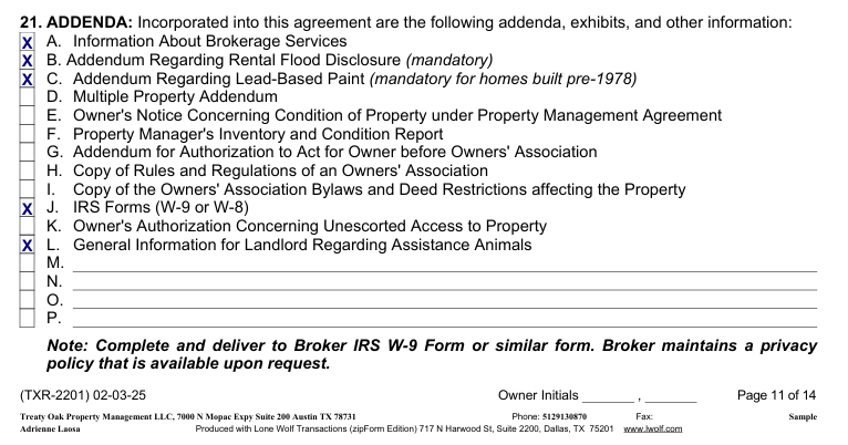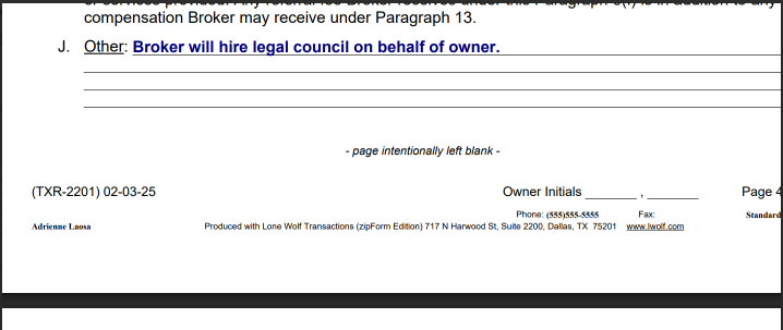 • Include initial fields on every page at the bottom for the broker and the landlord. If there is one landlord/owner, then they only need to initial once. If there are two landlords/owners, each one needs to sign + initial.
