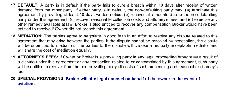 • The only verbiage that should follow Special Provisions is: "Broker will hire legal counsel on behalf of the owner in the event of eviction."