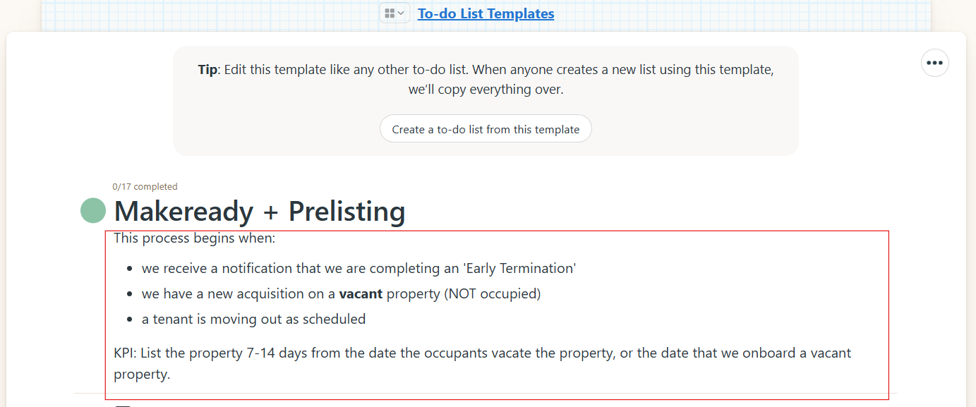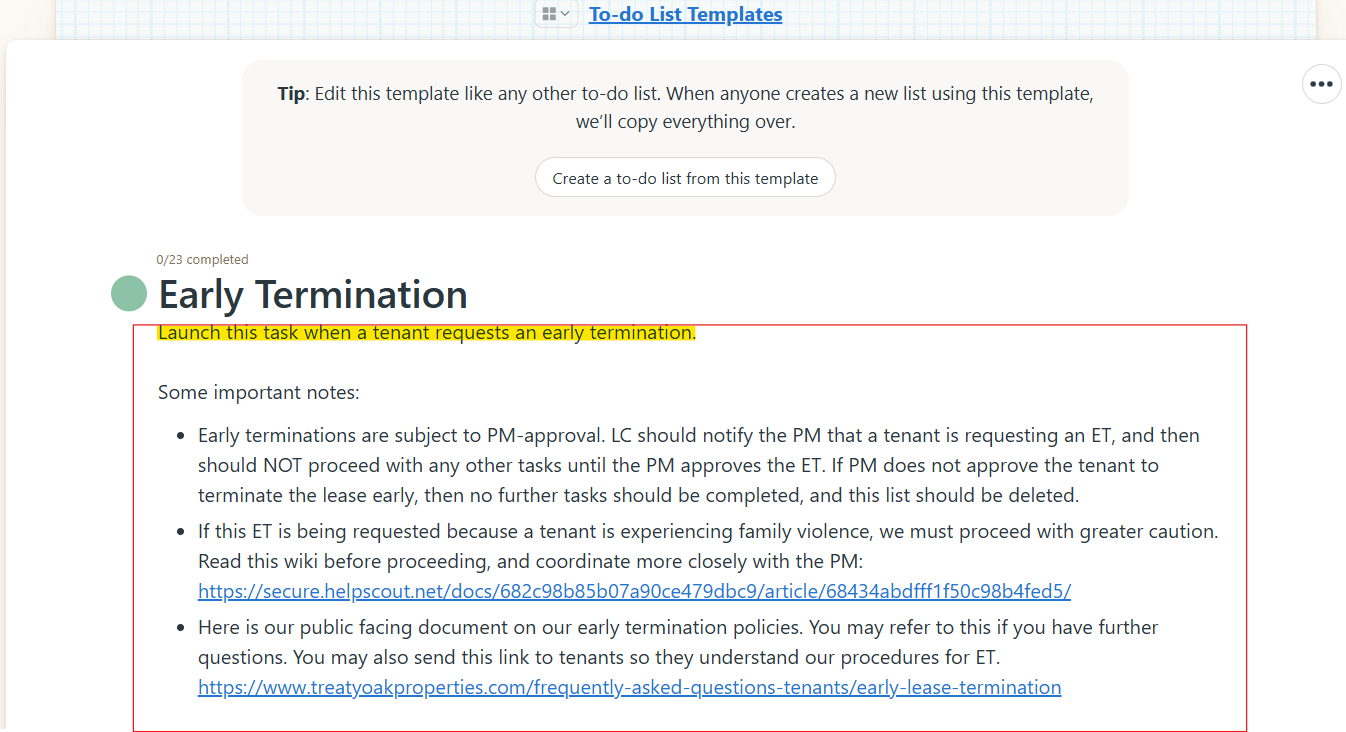 The Task List Template 'Descriptions' will help you understand when and how a particular list is used. For example, they will tell you the exact situations in which you'll want to launch these lists, helpful reminders on when NOT to launch the list (and if you need to use a different list instead), and other helpful notes.