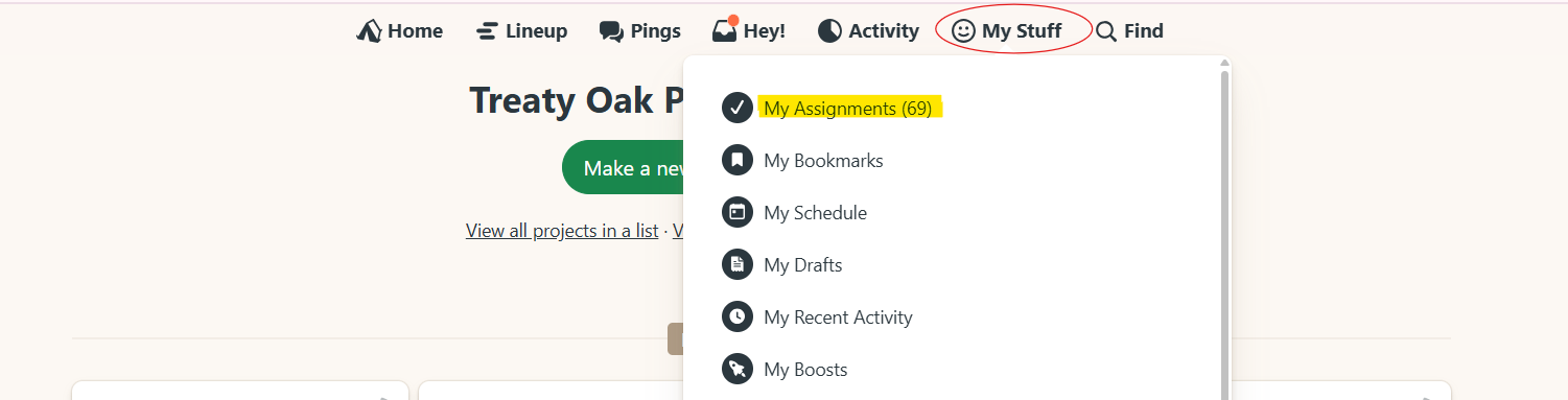 The “Your Assignments” section on the Basecamp homepage shows everything assigned to you across all projects.
