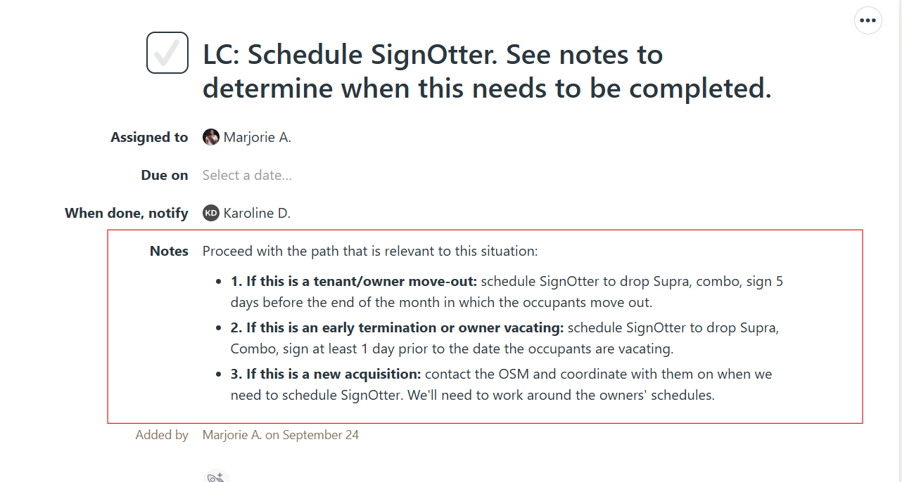If it's helpful, you can drop helpful information and links into the 'Notes' section of any task. You can likewise also @ other team members in the notes if you need to communicate on a task.